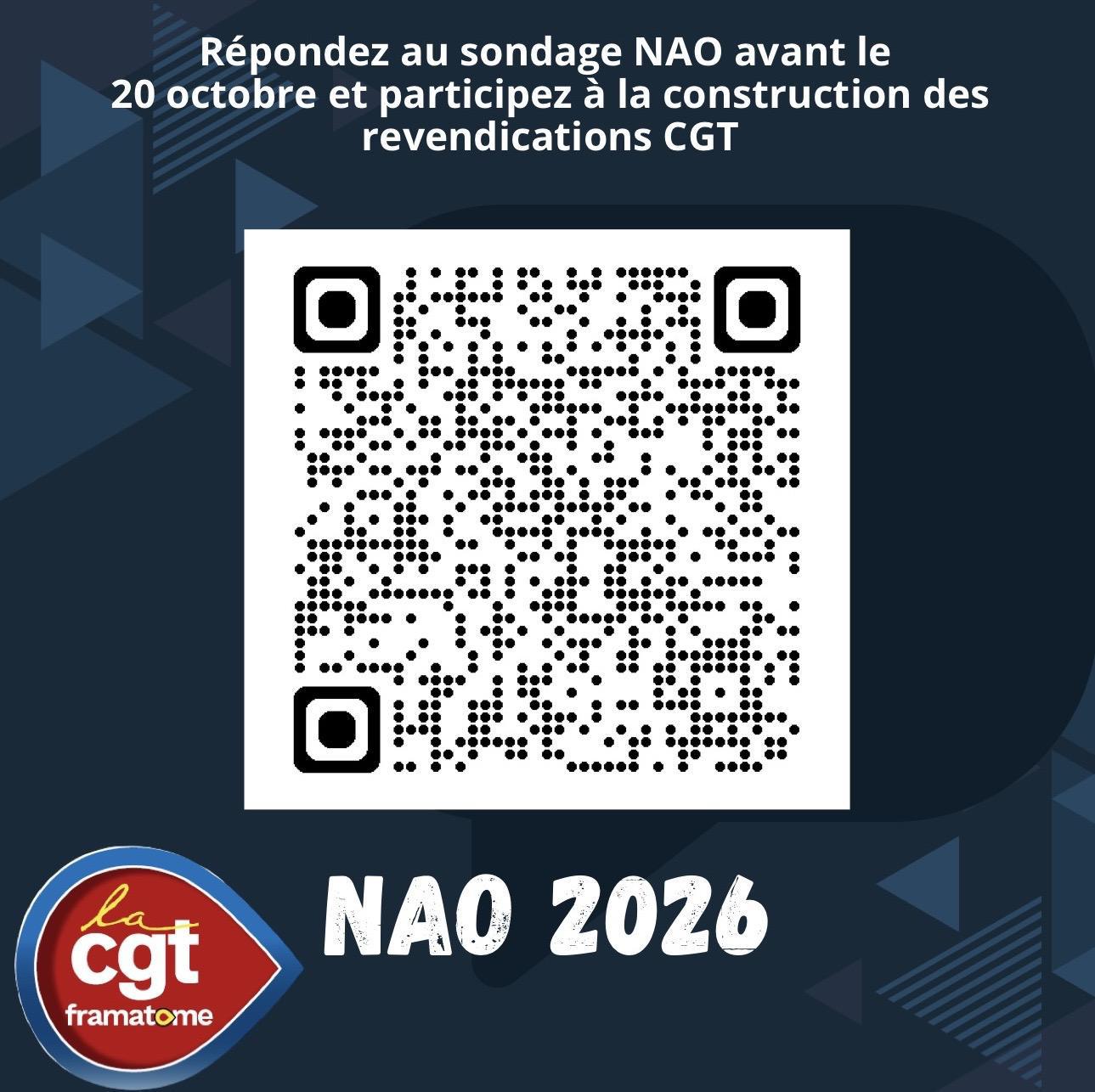 Comme chaque année, la CGT Framatome vous invite à partager vos attentes et revendications pour les Négociations Annuelles Obligatoires (NAO) 2026, qui se tiendront les 4, 11 et 16 décembre 2025 📅.