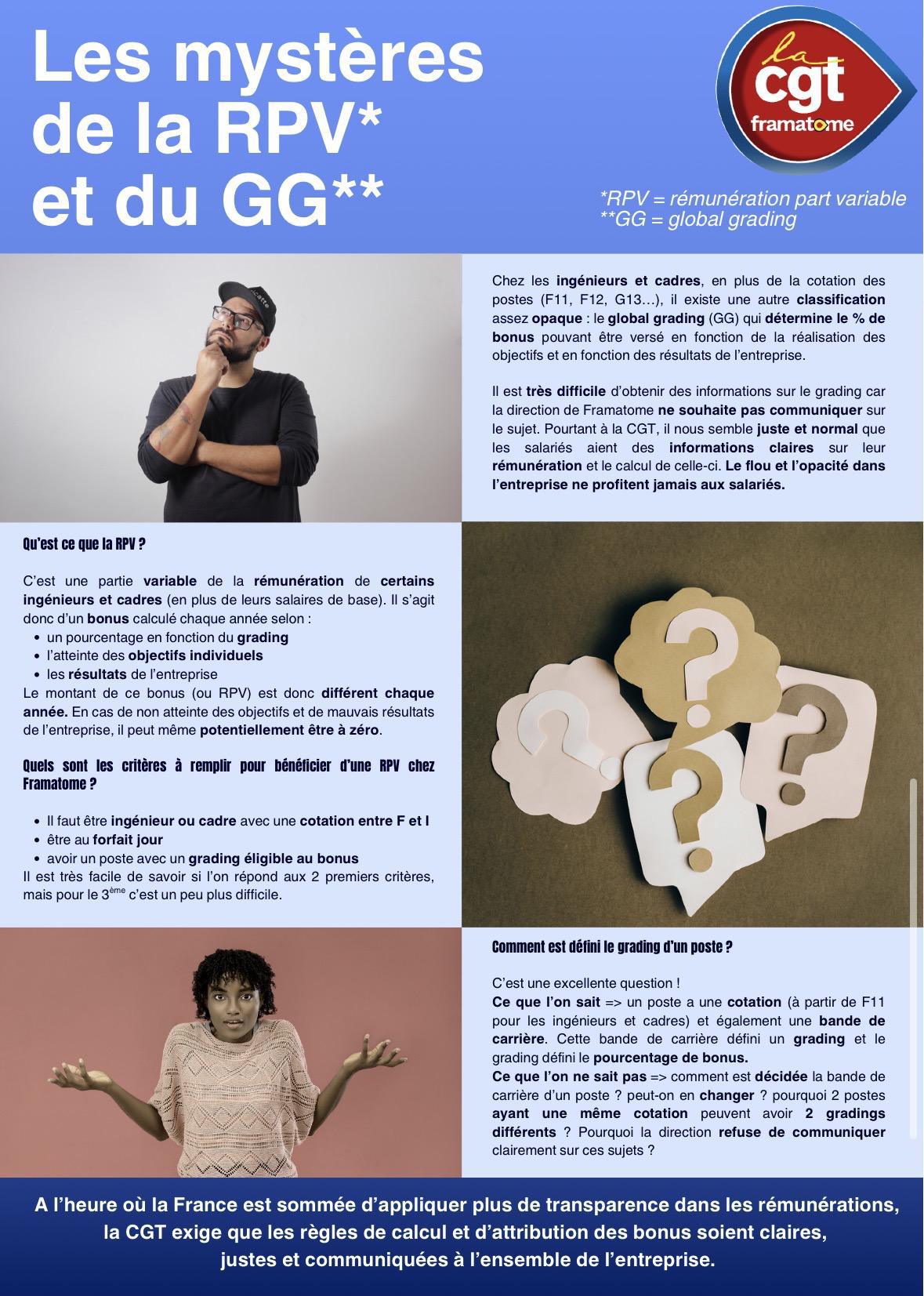 La CGT vous explique les parts variables. Un manque de transparence de la part de la direction. La CGT exige de la clarté surtout au lendemain de la nouvelle directive européenne sur la transparence des rémunérations. Framatome doit s'y conformer.
